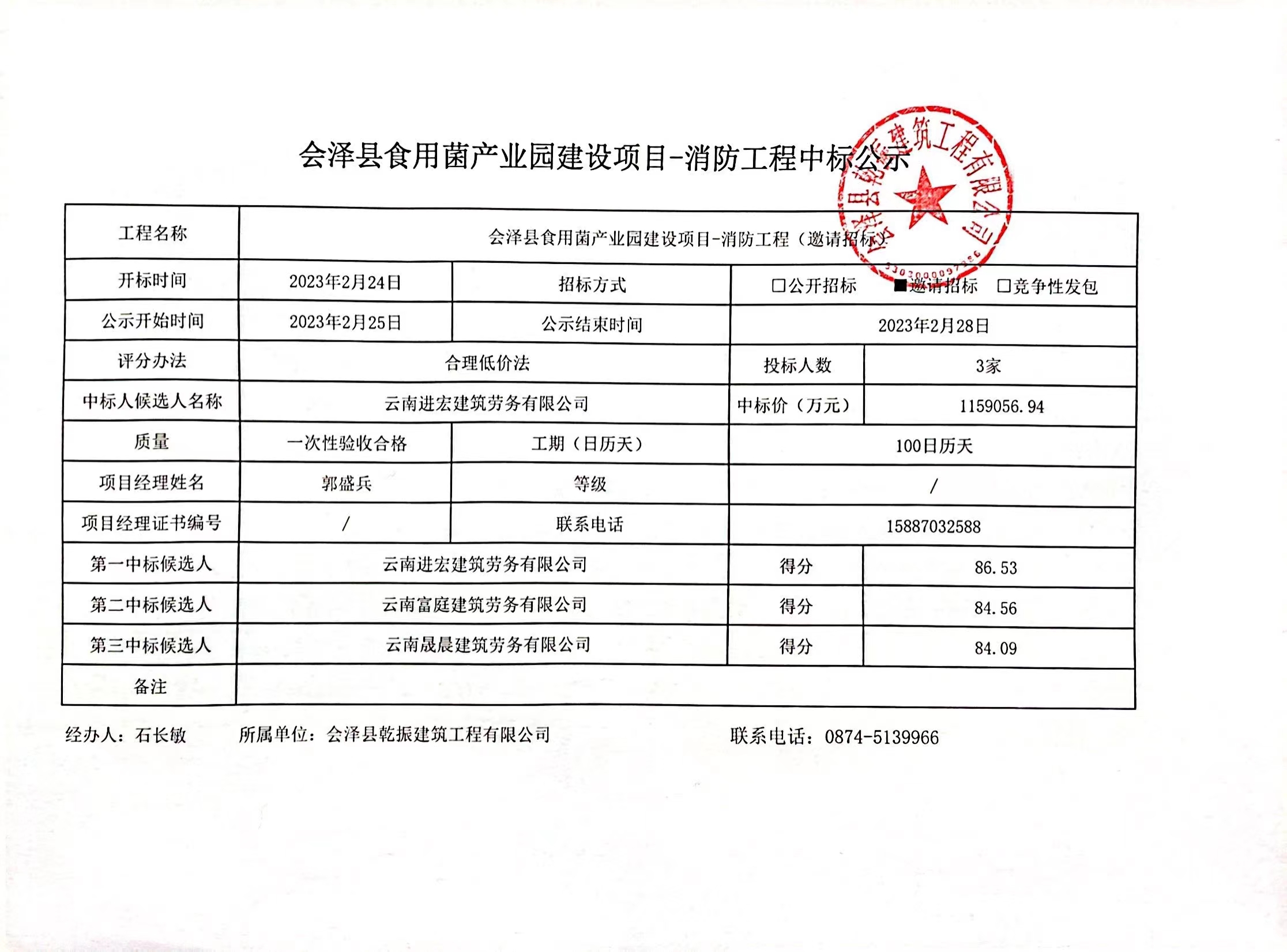 会泽县食用菌产业园建设项目-消防工程劳务分包中标公示